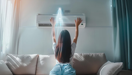 Young woman switching on air conditioner while sitting on white sofa at white home room