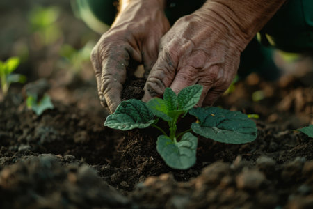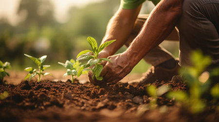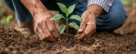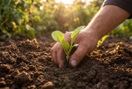 A farmer is planting a young seedling into the rich brown soil, symbolizing growth and sustainability in agriculture.