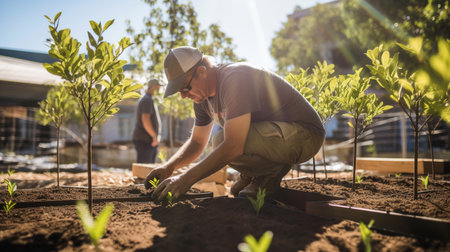 A person diligently plants young trees in a community garden, fostering growth and nurturing the Earth in a sustainable, eco-conscious environment