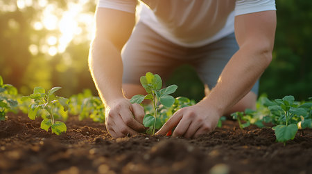 A dedicated gardener carefully plants young seedlings in rich, dark soil, symbolizing the nurturing of life and sustainability in modern gardening practices under warm sunlight.