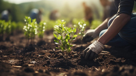Volunteers plant young tree saplings into rich soil, working together outdoors on a reforestation project to restore habitat, promote sustainability and green growth