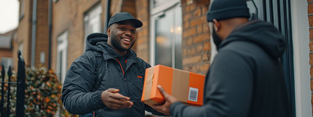 cheerful courier hands over well branded package delighted customer outside their home, showcasing trust and satisfaction in delivery services