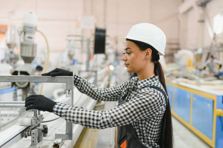 Focused female factory worker wearing safety helmet and gloves operating machinery in a modern pvc window and door production line