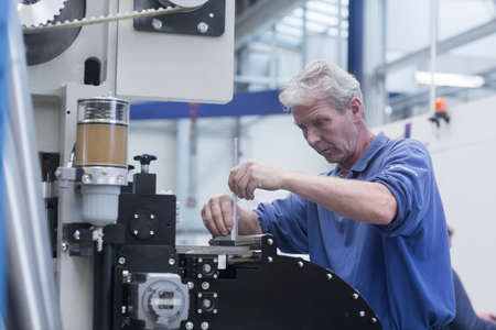 Group of skillful workers using machine equipment in factory workshop . Industry and engineering people technology concept .