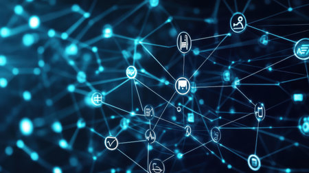 A captivating digital abstract illustrating a network of interlinked blue icons, symbolizing technology, data exchange, and communication in a modern and innovative environment.
