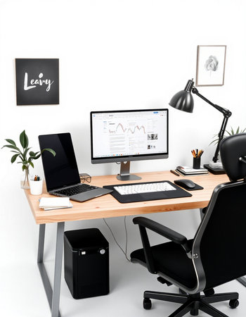 Contemporary digital rendering that conveys a productive and inviting mood through precise composition and subtle warm illumination. Suited for interior design showcases, coworking space promotions, professional lifestyle visuals, and branding for remote teams or creative firms. Its clean lines and harmonious elements offer flexibility for web banners, social media g... AI-generated illustration.
