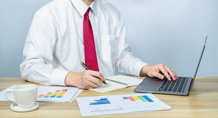 executive write on notebook while using laptop on working desk with white copy space background, professional businessman busy work on the business data graph