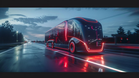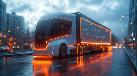 Futuristic autonomous smart truck with neon lights on a rainy night in the city.