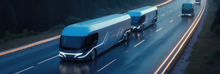 Futuristic trucks fleet on highway at modern city, Transportation innovation concepts of car.
