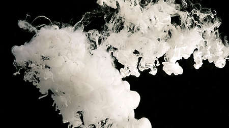 Black and white fantastic art. Abstract background. White cloud of milky ink. White watercolor ink in water on a black background.