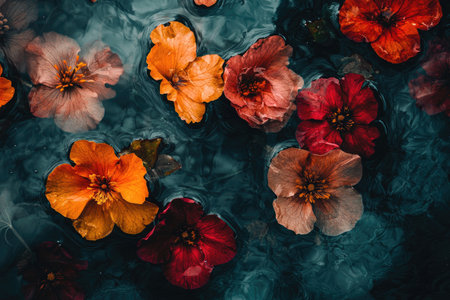 Close-up of water with colorful flowers floating in it, dark blue and rust color palette, vintage aesthetic, film photography, ethereal background. --chaos 30 --ar 3:2 --quality 2 --stylize 250 --v 6.1 Job ID: 1dfb4f07-fab4-414a-9bd6-87e80356bc92