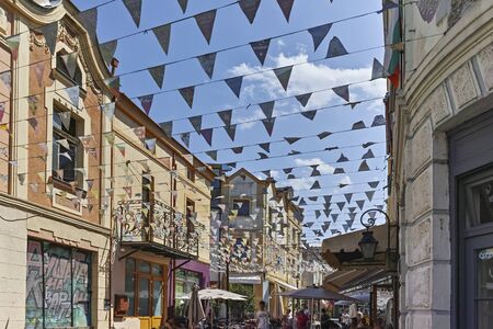 PLOVDIV, BULGARIA - JULY 5, 2018: Street and houses in district Kapana, city of Plovdiv, Bulgaria