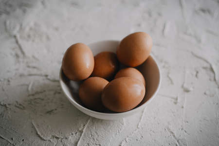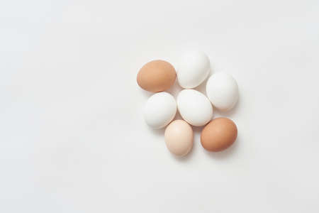 Raw organic farm eggs. Served on white background with copy space. Selective focus image.