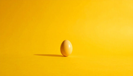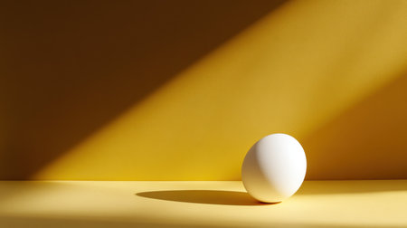 A beautifully lit white egg stands alone against a vibrant yellow background, casting a soft shadow that enhances the minimalist aesthetic.