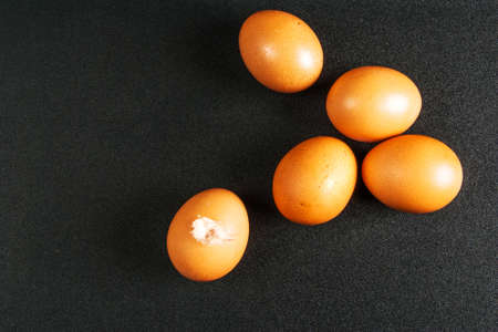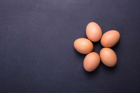 Top view fresh Eggs in bowl on black stone table background. Free space for text and design