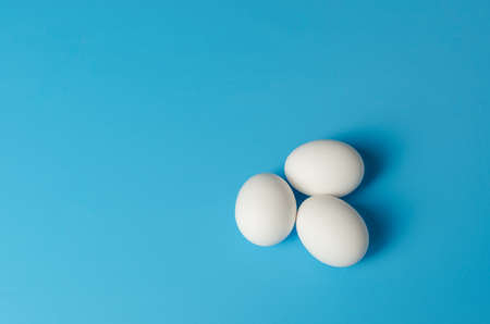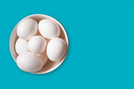 Chicken white eggs on a light sandy background. Top view, flat lay.