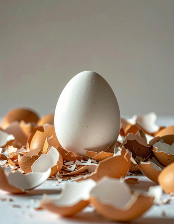 In a scene of disarray and remnants of the past, a single, perfect egg stands tall. It represents resilience, survival, and the enduring potential for a new beginning amidst chaos.
