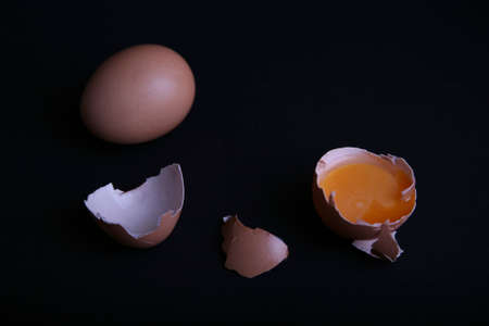 Minimal composition of traditional healthy italian food. Tasty and fresh brown chicken eggs, raw and cooked, with their yellow yolk and egg white. Protein breakfast. Natural healthy food and organic farming concept.