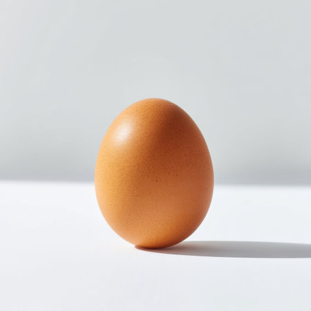 A brown egg rests on a neutral background, accompanied by soft lighting and a gentle shadow. Ideal for food-themed projects, recipes, or culinary designs.