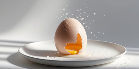 AI Generated. Smoky Raw Egg Sitting on a Plate with Cracked Shell and Sea Salt Garnish