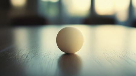 A minimalist close-up image of a solitary ping pong ball resting on a wooden table. The soft focus background and natural light create a serene atmosphere, highlighting themes of sport and leisure.