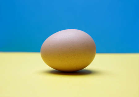 fresh beautiful chicken egg on the background of the Ukrainian flag. selective focus. High quality photo