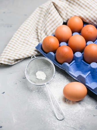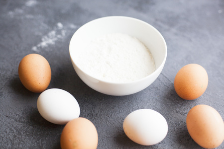 Ingredients for pastries: flour, eggs on gray background