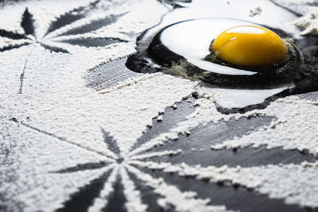 The process of making cannabis pastries. You can see a raw broken egg, a rolling pin, flour, and dried marijuana inflorescences.