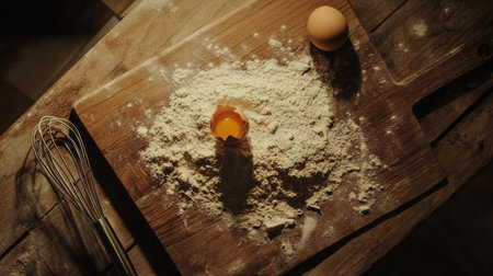 Scattered flour surrounds a broken egg on a rustic wooden board, signaling the start of a baking session in a cozy kitchen.
