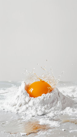A striking image of a fresh egg perched on a mound of flour, splashing dramatically against a dark background, perfect for food-related themes.