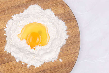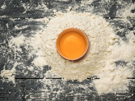 Top view of raw egg in the white flour on the wooden board.