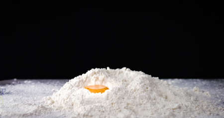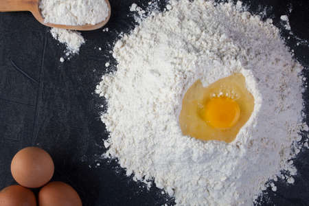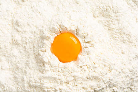 Egg falls on white flour. Ingredients for making fresh bread or pasta