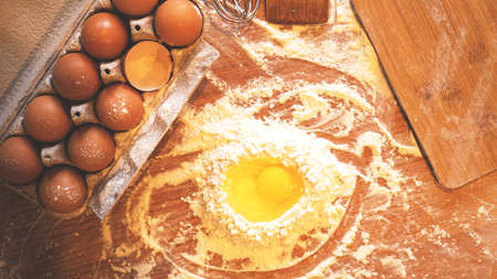 Ingredients on the background of the kitchen table flour, broken eggs, and rolling pin. Process of cooking pastry or pie.