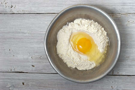 A metal dish with flour and egg's yolk on the white wooden table