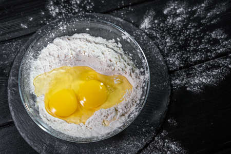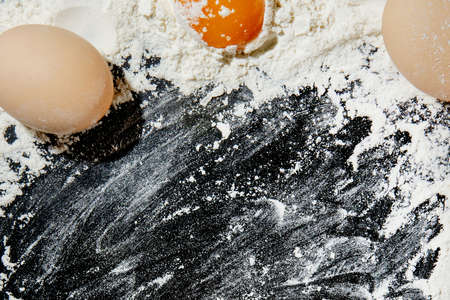 White flour and egg on a black background.Copy space.