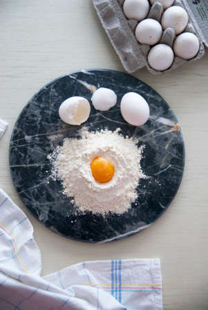 Pile of wheat flour and and egg yolk on a granite kitchen counter. Top views, close-up.