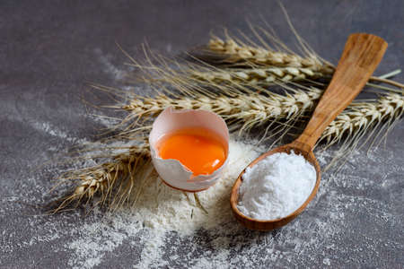 Whole egg and wooden spoon on flour background. Preparation of baking, kneading dough. Homemade food.