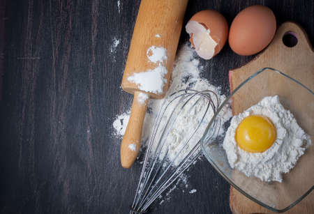 Baking utensils and baking ingredients with eggs, wheat flour, egg yolks