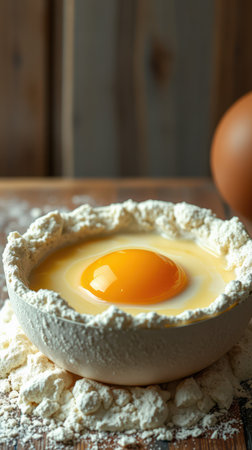 Fresh egg yolk surrounded by flour in a rustic kitchen setting for baking preparation