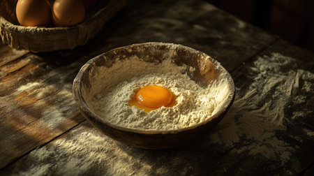 A rustic wooden table displaying a bowl of flour with an egg yolk, with flour dust swirling around, evoking the warmth of homemade baking.