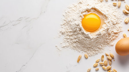 A heap of wheat flour on a white marble surface, with a cracked egg and scattered grains surrounding it, symbolizing classic baking ingredients. --chaos