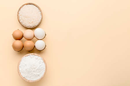 Bowls with rice, flour and eggs on color background