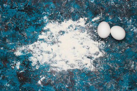 Flour, chicken eggs on a blue concrete background. Top view