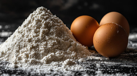 Flour and three brown eggs sit together, ready to create delicious pastries in a kitchen.