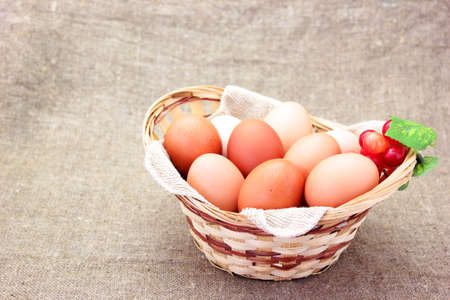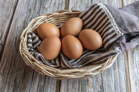 Brown chicken eggs in the wooden basket with cute fabric, close-up view.