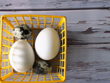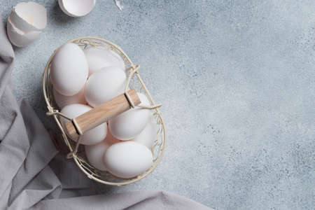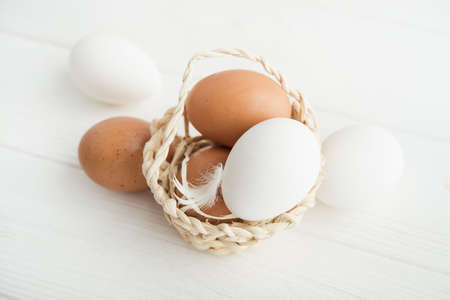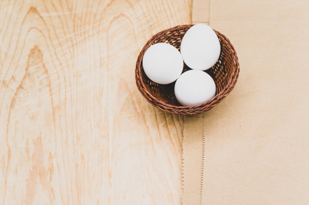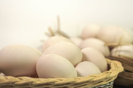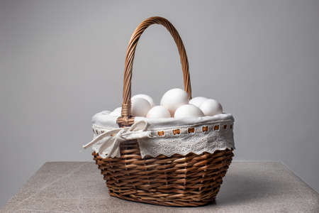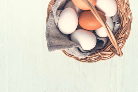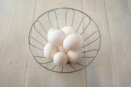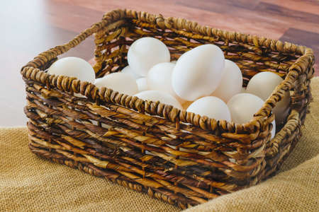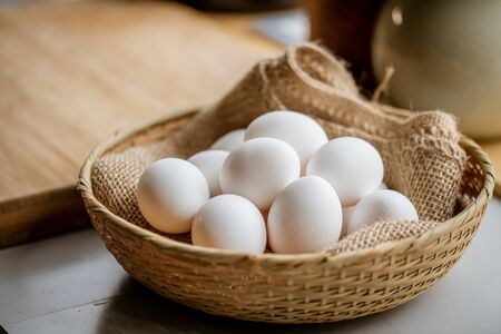 Basket of white chicken eggs on a wooden table in the chicken farm
