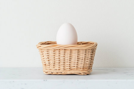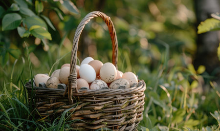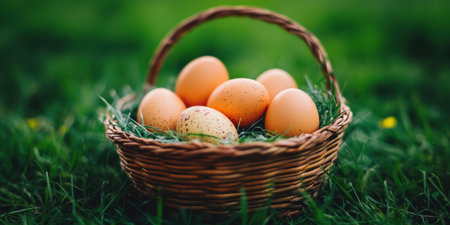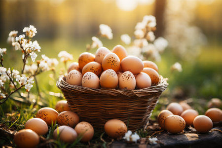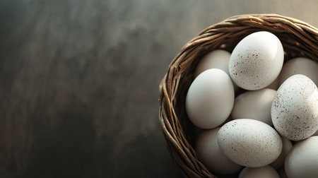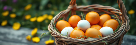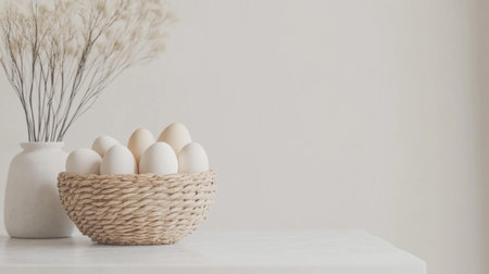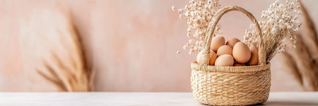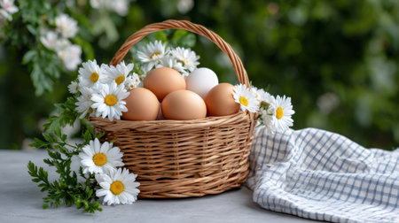 Fresh eggs and daisies nestled in a wicker basket evoke the essence of spring