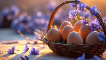Wicker basket filled with brown eggs surrounded by vibrant purple flowers on a wooden surface. Warm sunlight enhances the festive and springtime atmosphere.
