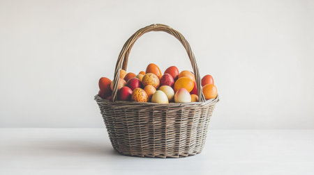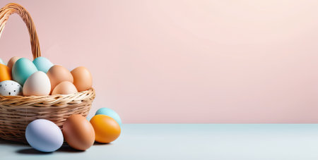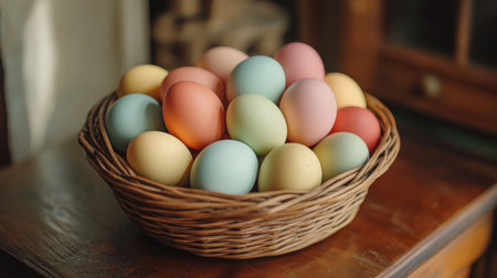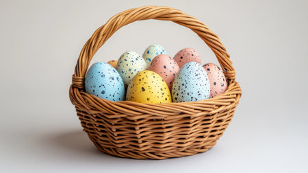 A charming wicker basket filled with pastel-colored Easter eggs, ready for a springtime celebration.