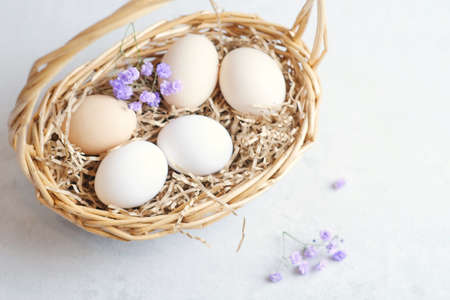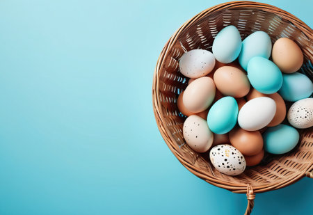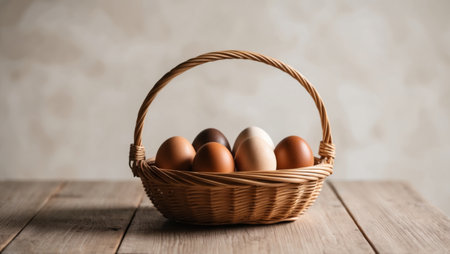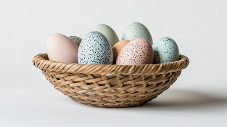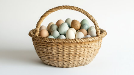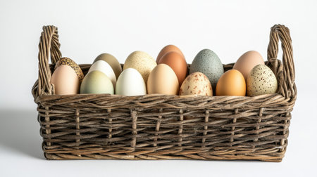 A beautiful arrangement of assorted fresh eggs in a woven basket on a light background, perfect for culinary or seasonal themes.